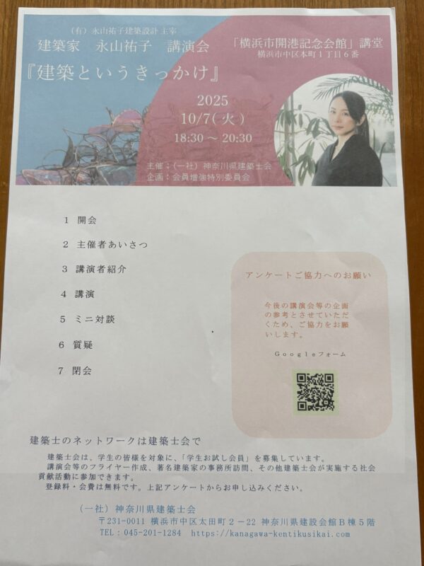 神奈川県建築士会主催、建築家永山祐子氏講演会が横浜市開港記念会館講堂において開催されました。